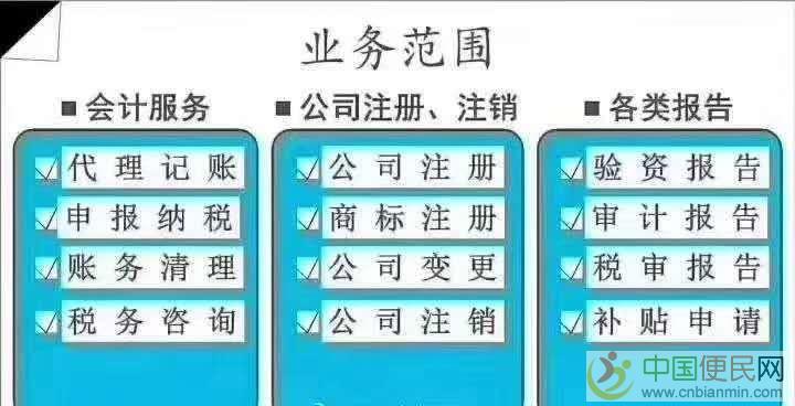 1、代办工商注册、年检、变更,税务登记及刻制公章业务;c~n~b~i~a~n~m~i~n~c~o~m 2、代理各行业记账、纳税申报;c+n+b+i+a+n+m+i+n+c+o+m3、小企业财务外包 税务顾问; c~n~b~i~a~n~m~i~n~c~o~m4、代办申请一般纳税人资格; 中 国 便 民 网5、代办验资及审计;c.n.b.i.a.n.m.i.n.c.o.m中.国.便.民.网